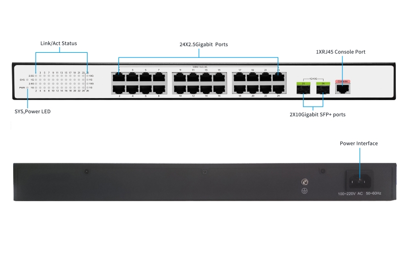 | Overview | Description | A high-density access switch featuring 24x 2.5G RJ45 ports and 2x 10G SFP+ uplink ports. Designed for enterprise workgroups, classrooms, or digital signage networks that require extensive multi-gigabit device connectivity with high-performance uplinks, offering comprehensive Layer 2 management. |