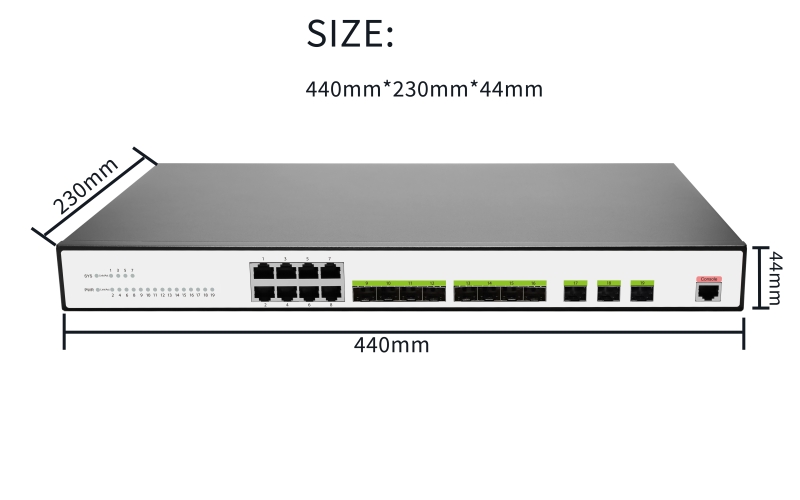 | Overview | Description | A hybrid aggregation switch featuring 8x 1G RJ45 ports and 11x 10G SFP+ fiber ports. Designed for connecting a mix of gigabit devices and high-speed servers or storage, serving as a cost-effective aggregation or core switch in small to medium-sized networks. |
