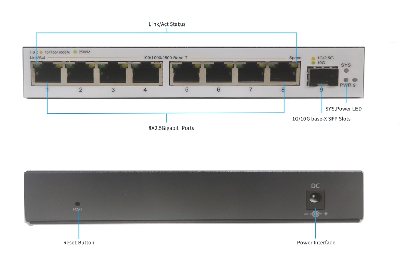 | Overview | Description | A compact, fanless desktop switch featuring 8x 2.5G RJ45 ports and 1x 10G Base-T RJ45 uplink port. With silent operation, wall-mount design, and plug-and-play simplicity, it is an ideal solution for expanding high-speed networks in home offices, creative studios, and small businesses. |